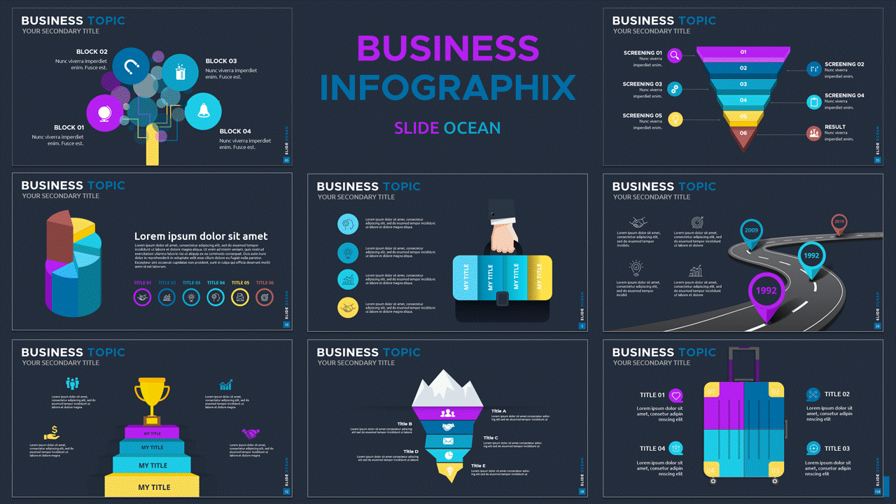 Nếu bạn đang tìm một bộ infographic siêu lớn – cực đa dạng – thiết kế chuẩn hiện đại để dùng cho mọi loại bài thuyết trình, thì đây chính là bộ sản phẩm toàn diện nhất từ Slideocean.