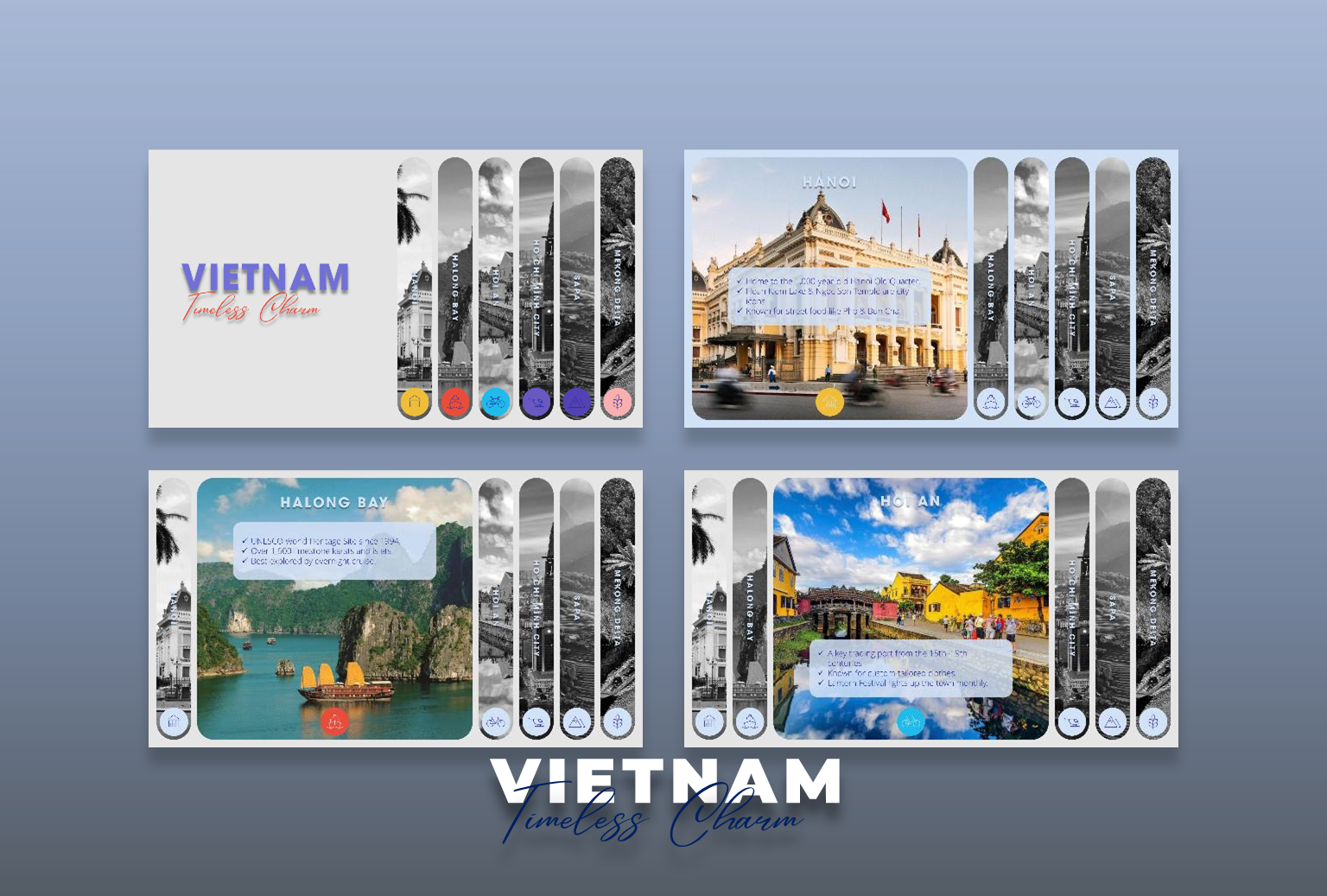 Trong bản demo, template tái hiện hành trình khám phá 6 điểm đến hàng đầu Việt Nam – Hà Nội, Vịnh Hạ Long, Hội An, TP. Hồ Chí Minh, Sapa và Đồng bằng Sông Cửu Long – dưới slogan “Vietnam Timeless Charm”. Mỗi slide kết hợp giữa hình ảnh sống động và thông điệp ngắn gọn, tạo nên một câu chuyện thị giác ấn tượng.