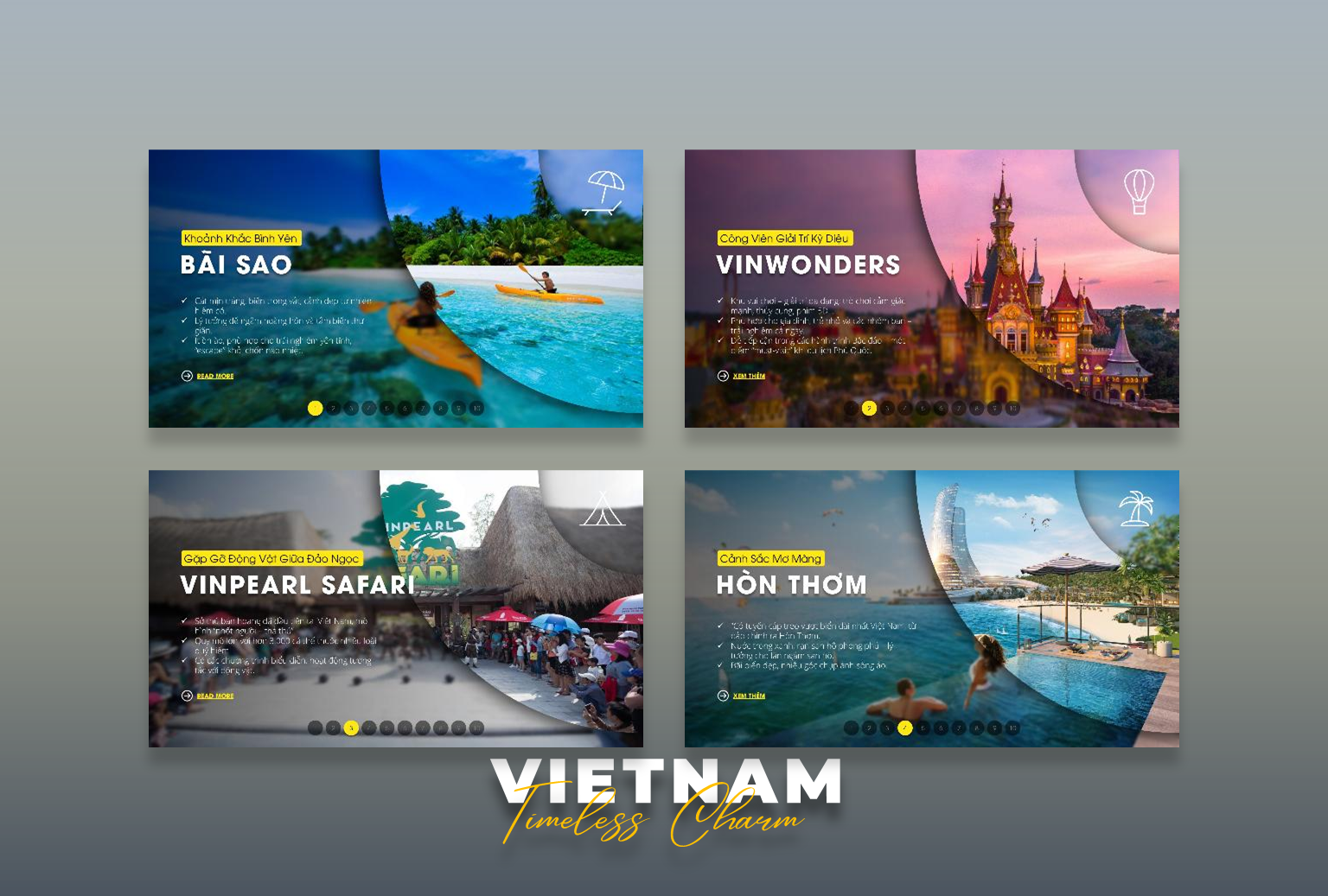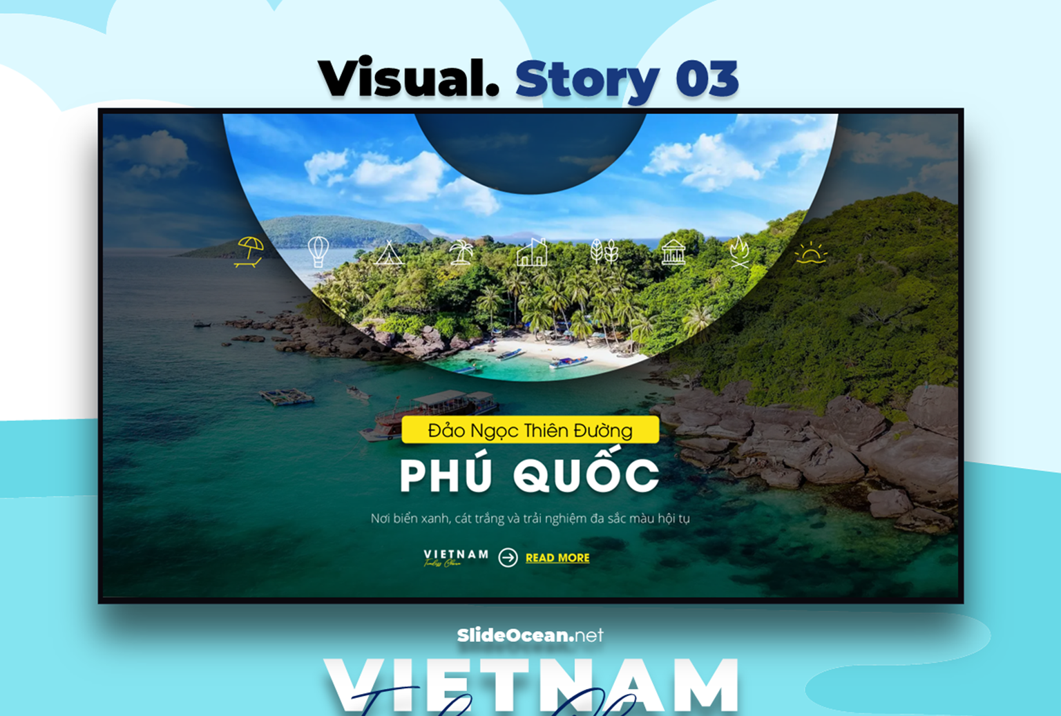 Visual Story Morph 03 là bộ template PowerPoint được thiết kế với hiệu ứng Morph Transition mượt mà, giúp bạn biến những hình ảnh du lịch thành một câu chuyện sống động, lôi cuốn. Bộ demo này chọn lọc 10 điểm đến đẹp nhất Phú Quốc, đưa người xem đi qua một chuyến hành trình đầy màu sắc, từ bãi biển hoang sơ, làng chài yên bình cho đến khu vui chơi giải trí hiện đại.