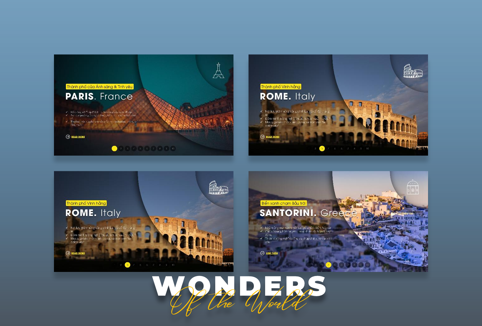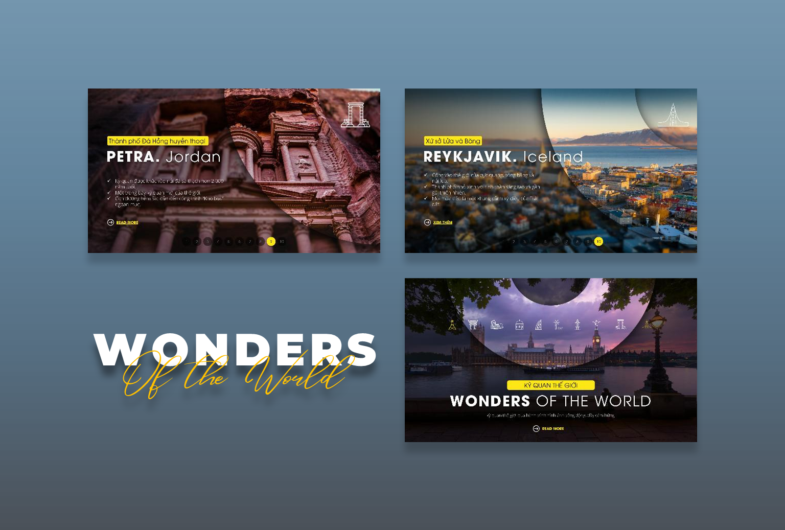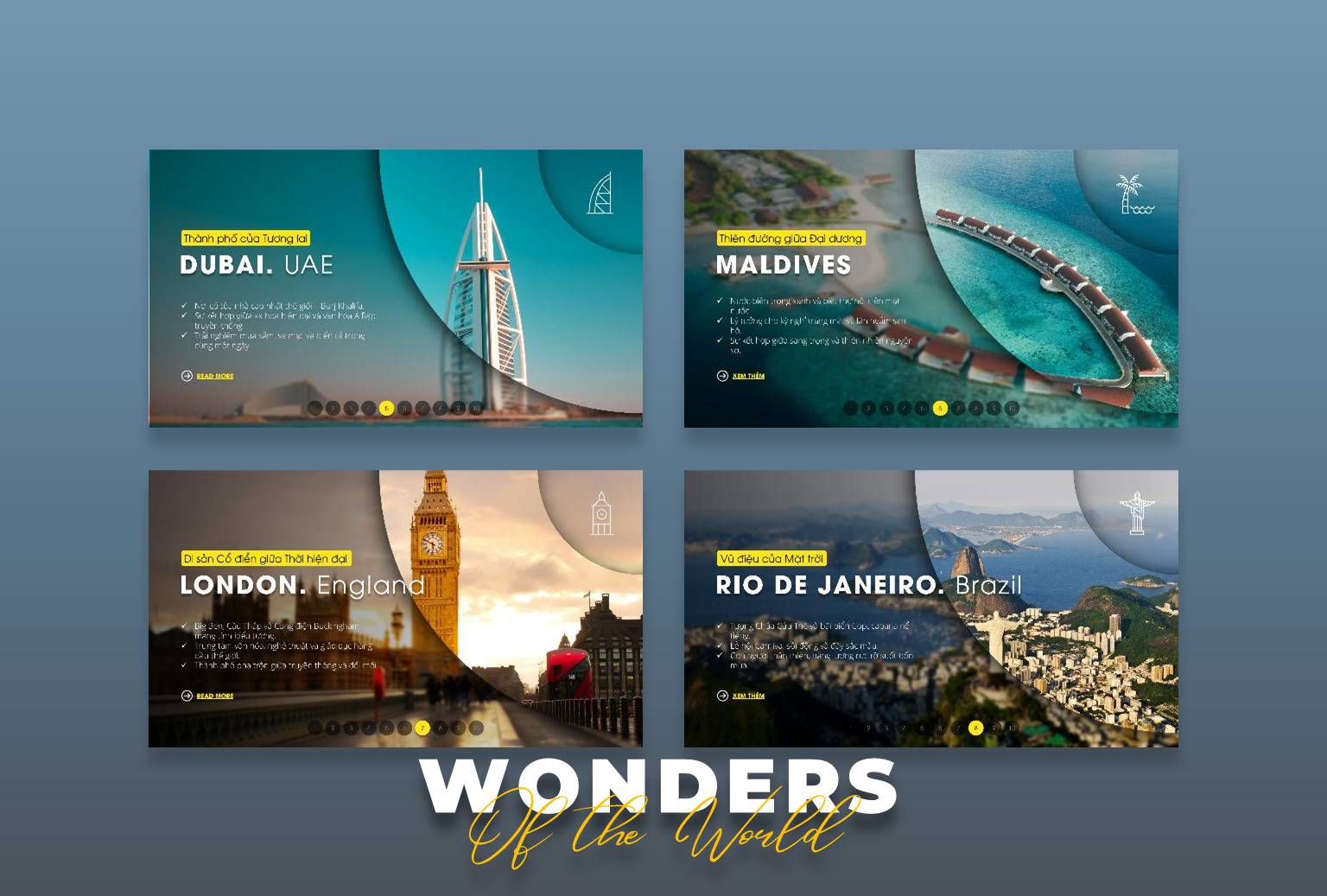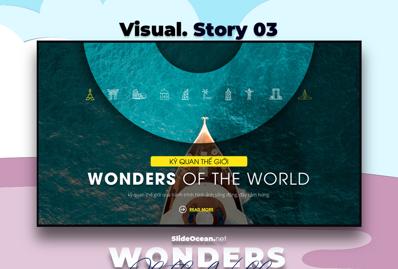 Visual Story Morph 03 là bộ template PowerPoint được thiết kế với hiệu ứng Morph Transition mượt mà, giúp bạn biến những hình ảnh du lịch thành một câu chuyện sống động, lôi cuốn. Bộ demo này chọn lọc 10 Wonders of the World và 10 điểm đến đẹp nhất Phú Quốc, đưa người xem đi qua một chuyến hành trình đầy màu sắc, từ bãi biển hoang sơ, làng chài yên bình cho đến khu vui chơi giải trí hiện đại.