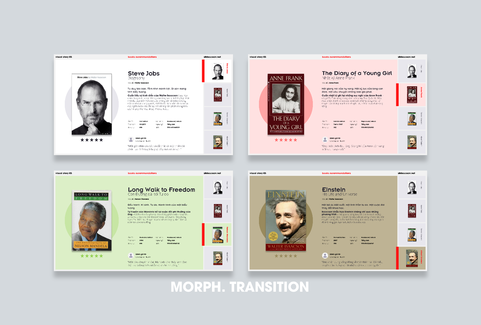 Visual Story 05 là một bộ template Morph Transition cao cấp được thiết kế để giúp bạn kể bất kỳ câu chuyện nào theo phong cách “book intro / movie intro / character profile” đầy cảm xúc.